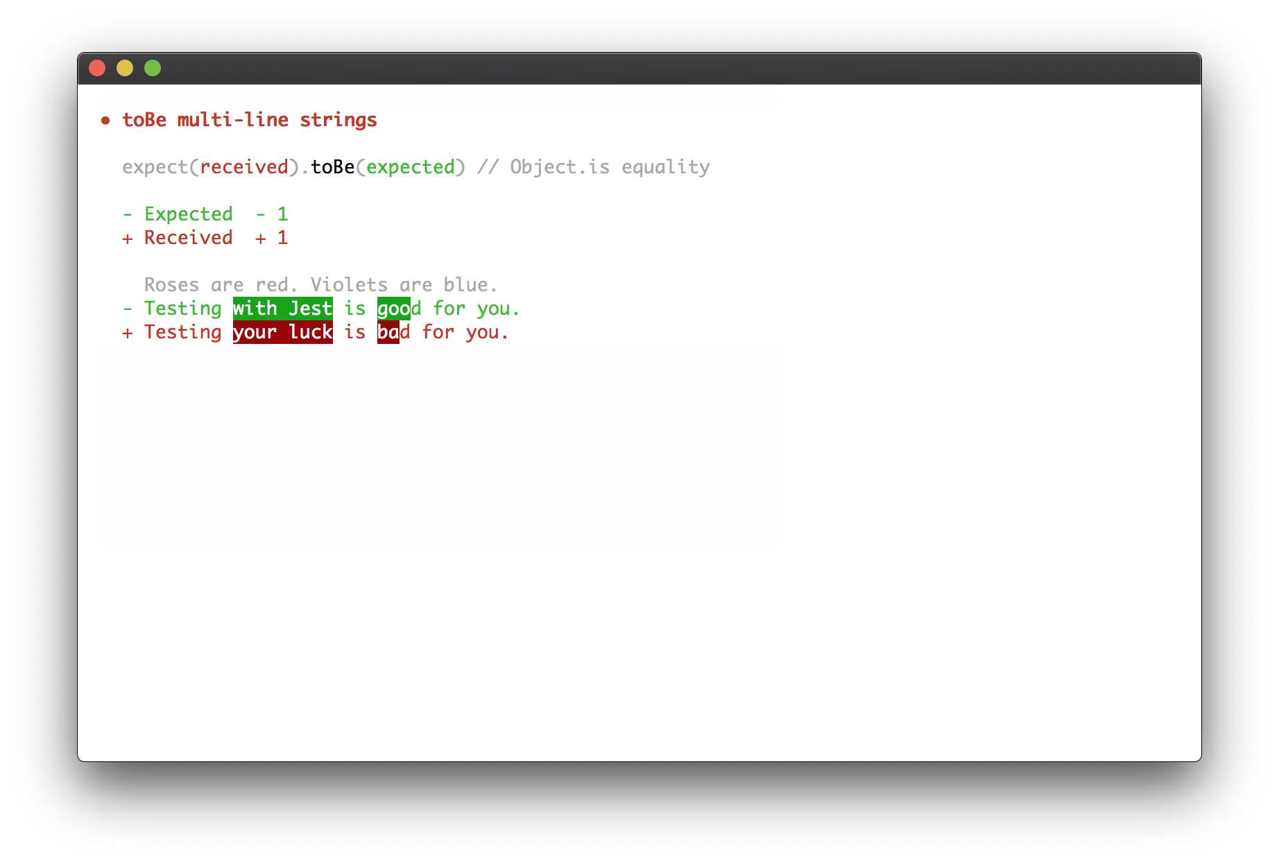 Tests fail—when they do, Jest provides rich context why. Here are some examples: